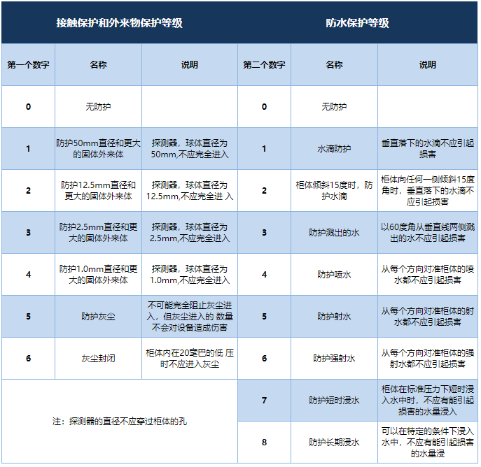 防護(hù)等級(jí)多以IP后跟隨兩個(gè)數(shù)字來表述,數(shù)字用來明確防護(hù)的等級(jí)。
