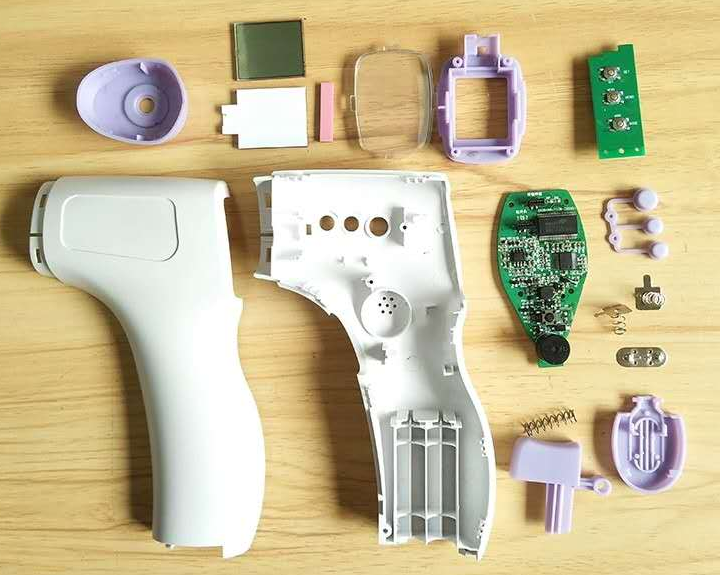 以上是 常規(guī)體溫槍的參數(shù)介紹,那么實現(xiàn)這些功能,基本需要各種零件來實現(xiàn),測溫需要紅外感應電子器件,溫度的計算和顯示需要編程來時間,啟動和功能的切換需要按鍵來實現(xiàn),下面看下體溫槍的拆解:
