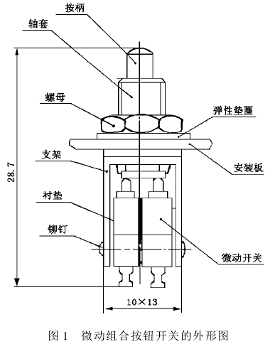 微動(dòng)組合按鈕開(kāi)關(guān)將兩個(gè)微動(dòng)開(kāi)關(guān)用鉚釘固定在支架部件上組合而成。在支架上鉚有套管,利用套管上的螺紋可將開(kāi)關(guān)用螺母固定在安裝板上。